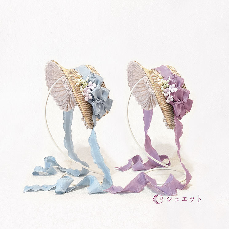 今回ボンネットのブリム(つば)内側に使用するレースのデザインはすべて『薔薇のレース』で、カラーは【クラシックアイボリー(アンティーク調のアイボリー)】です。上品なシュエットオリジナルカラーです。